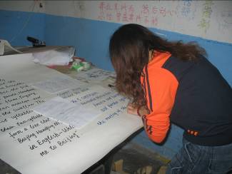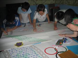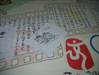活動(dòng)一確立下來,大家就明確分工,利用課余時(shí)間采購(gòu)材料、工具;查找相關(guān)資料并做出篩選;設(shè)計(jì)板式處理圖片,利用晚上的時(shí)間齊聚三號(hào)樓地下室開始我們的制作過程。雖然環(huán)境簡(jiǎn)陋,卻絲毫不能分散工作時(shí)的注意力。大家一齊上陣,邊寫邊畫,好不熱鬧。