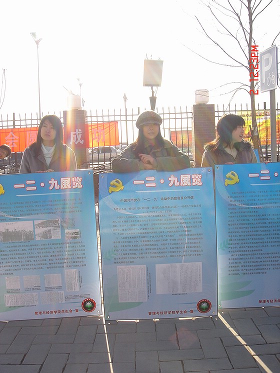 2007年12月13日,管理與經(jīng)濟學院學生會在良鄉(xiāng)校區(qū)食堂門口舉行了“銘記歷史 ,樹愛國之心,振興中華,立報國之志 ”紀念“一二九”72周年的活動。此次“一二九”宣傳活動包括“一二九”簽名、“一二九”感想留言、圖片等一系列活動。通過活動,抒發(fā)同學們對“一二九”的感想。本次活動舉行順利,并取得了圓滿成功。