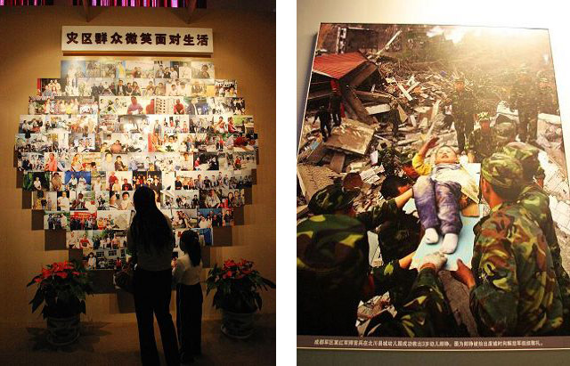展覽的第一部分“堅強領(lǐng)導,心系人民”,介紹了在災(zāi)害發(fā)生后黨中央、國務(wù)院和中央軍委緊急決策部署,中央領(lǐng)導同志親臨一線指揮,堅持人民生命高于一切的指導方針全面展開救援工作。第二部分“爭分奪秒,全力營救”,介紹了部隊、武警、公安緊急開赴地震災(zāi)區(qū),火速解救被困群眾,同時竭盡全力救治傷員,奮力搶修基礎(chǔ)設(shè)施,保證人民生命和財產(chǎn)的安全。第三部分“臨危不懼,奮起自救”展示了在救援同時,災(zāi)區(qū)黨委政府緊急行動,尤其是基層黨組織和共產(chǎn)黨員發(fā)揮中流砥柱的作用,帶領(lǐng)受災(zāi)地區(qū)各族群眾頑強抗爭。展覽的第四部分“八方支援,共克時艱”記述了各地、各部門傾力支援災(zāi)區(qū),社會各界向災(zāi)區(qū)送溫暖、獻愛心,港澳臺同胞和海外華僑、華人情系災(zāi)區(qū)以及國際社會提供的有力支持和援助。第五部分“恢復生產(chǎn),重建家園”向大家展示了災(zāi)區(qū)近況和規(guī)劃,災(zāi)區(qū)群眾正在堅持自力更生,在八方力量的幫助下,共同譜寫美好未來。最后一部分“偉大精神,不竭動力”總結(jié)了抗震救災(zāi)中的偉大精神和英雄人物,他們彰顯了偉大的民族精神,有以邱光華等為代表的時代英雄,也有以鄒雯櫻、林浩為代表的英雄少年。他們是中華民族崇高精神的代表,是祖國奮進的強大動力。在結(jié)束部分,“勝利屬于英雄的中國人民”的浮雕是對此次抗震救災(zāi)最好的詮釋。