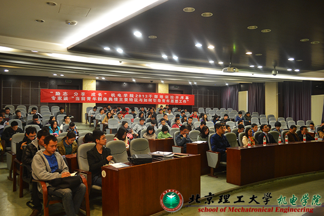 2013年10月27日下午,北京理工大學機電學院“勵志 分享 成長” 2013團學骨干培訓啟動儀式在研究生樓101成功舉行。北京團市委宣傳部副部長胡一峰,北京理工大學機電學院黨委副書記、副院長楊瑞偉,機電學院團委書記章濤,學院團委全體老師和120余名本科和研究生團學骨干參加了本次啟動儀式。
