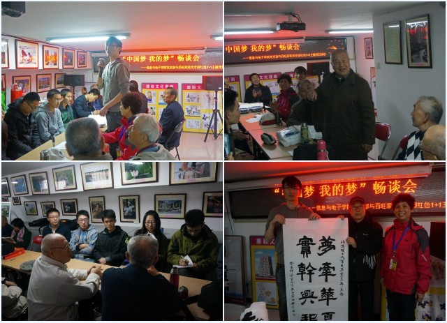 為了增進在思想上的交流,10月23日,雙方黨支部組織開展了“中國夢·我的夢”暢談會,就對“中國夢”的認識和如何在平時生活中踐行“中國夢”進行了深入交流。暢談會上,社區(qū)黨支部的長者們結(jié)合“中國夢”向第二黨支部的大學生們講述了年輕時的故事,分享人生感悟,并提出了“修身、務實、走群眾路線”的殷切期望。曹華老同志還現(xiàn)場填詞一首《相見歡》:“今又講臺教樓,歲月悠,借得長案,相對話題稠。青春燦,斗志煥,即出手。國富民強,夢圓憑勁頭。”關老同志更是現(xiàn)場演唱了《我和我的祖國》。暢談會結(jié)束后,社區(qū)黨支部的老同志們還贈以“夢牽華夏,實干興邦”、“大展宏圖”等多幅書法作品,以此表達對大學生黨員的勉勵與希冀之情。![]()