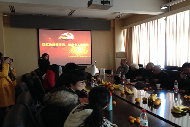 下午2時,支部共建活動準(zhǔn)時召開。首先,外國語學(xué)院2011-2013級黨支部書記劉春游代表學(xué)生支部發(fā)言,希望學(xué)生黨員能以此為契機(jī),通過聆聽老教授們的切身經(jīng)歷和真誠教誨,能有所啟發(fā)和收獲。之后教師黨支部書記張錦州老師介紹到場的老師們。此次參加活動的老師均為外國語學(xué)院退休的老干部,年齡最大的已有88歲,他們都曾在自己的教學(xué)崗位上兢兢業(yè)業(yè),對黨、國家和學(xué)校都有非常深厚的感情。