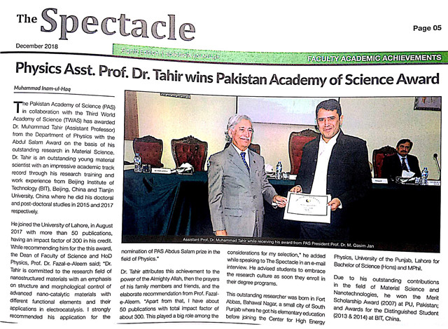 據(jù)the Spectacle報(bào)道,2018年12月,巴基斯坦科學(xué)院和發(fā)展中國(guó)家科學(xué)院授予我校材料學(xué)院2011級(jí)校友、巴基斯坦籍...