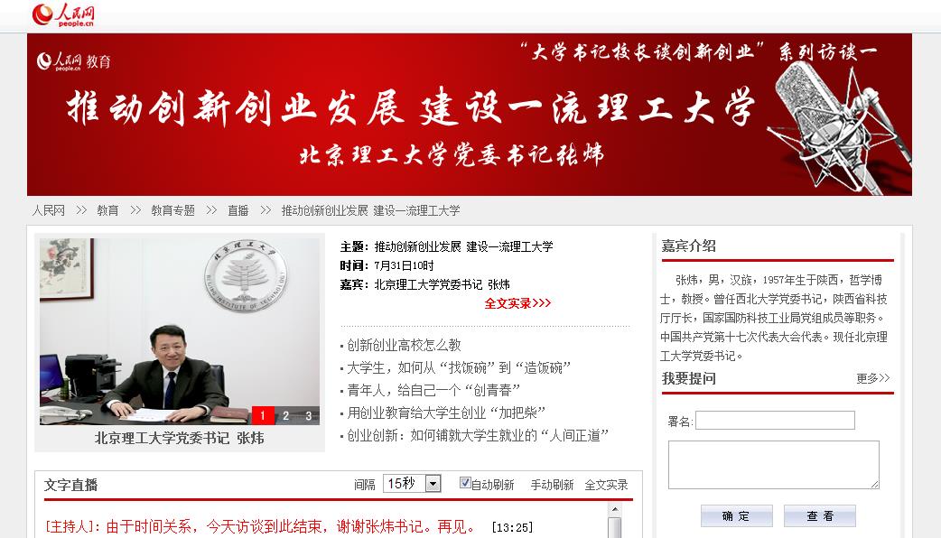 北理工黨委書記張煒做客人民網(wǎng):推動(dòng)創(chuàng)新創(chuàng)業(yè)發(fā)展 建設(shè)一流理工大學(xué)