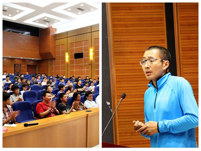 在之后的提問環(huán)節(jié)中,同學(xué)們積極踴躍。面對大家的疑問,于嘉老師展現(xiàn)出了央視解說員的絕頂口才,生動形象地回答了在場觀眾的一個(gè)又一個(gè)問題,不時(shí)引起全場觀眾的掌聲和歡笑。講座結(jié)束后,于嘉老師帶領(lǐng)大家去北湖跑步并進(jìn)行了合影留念。