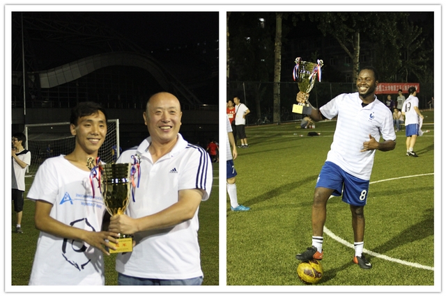 賽后的頒獎儀式上,校體育部書記韓琪同志為冠軍球隊頒發(fā)獎杯,在巴西世界杯主題曲《We Are One (Ole Ola)》的背景下,各代表隊和觀眾的歡呼聲不絕于耳,化工學(xué)院代表隊高舉冠軍獎杯,大聲喊出:我們是冠軍!