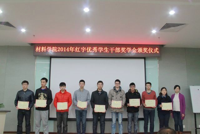 隨后,頒發(fā)了材料學(xué)院2014年度紅宇優(yōu)秀學(xué)生干部獎(jiǎng)學(xué)金。紅宇優(yōu)秀學(xué)生干部獎(jiǎng)學(xué)金是由重慶紅宇精密工業(yè)有限責(zé)任公司捐資設(shè)立,獎(jiǎng)勵(lì)學(xué)習(xí)態(tài)度端正,工作能力強(qiáng),在學(xué)習(xí)、日常行為和科研工作中起模范帶頭作用的學(xué)生干部。劉艷老師為獲得2014年度紅宇優(yōu)秀學(xué)生干部獎(jiǎng)學(xué)金的付海東等10名同學(xué)頒發(fā)了榮譽(yù)證書。