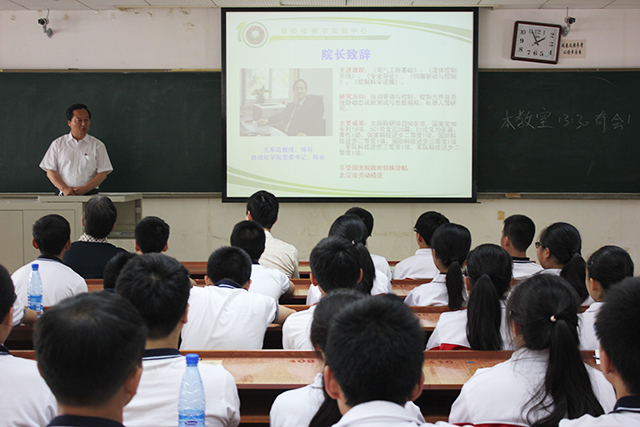 在開課儀式上,首先由自動化學(xué)院院長兼黨委書記王軍政致歡迎辭,王院長先代表自動化學(xué)院歡迎二十二中師生來學(xué)院參加科技實踐開放課;并列舉了大量形象生動的事例向?qū)W生們介紹了自動化技術(shù)在工業(yè)生產(chǎn)、武器裝備、日常生活中的應(yīng)用,并囑托學(xué)生們一定要打好基礎(chǔ)、積極參與實踐,通過學(xué)習(xí)文化課掌握基礎(chǔ)知識,通過參與實踐活動開闊視野、激發(fā)興趣、提升創(chuàng)新能力。