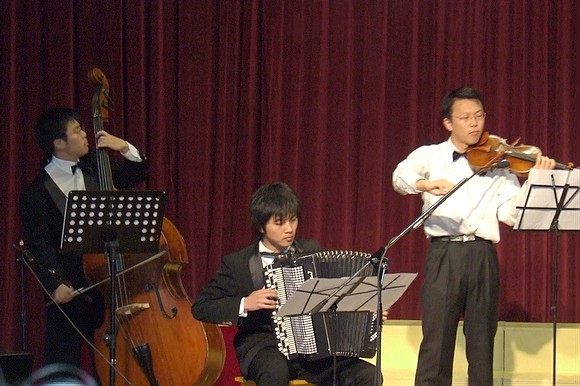 我校同學(xué)還演奏了小提琴與鋼琴協(xié)奏曲《沉思》、巴揚(yáng)琴與小樂(lè)隊(duì)表演《遺忘》、《洞》等曲目。演出高潮迭起,非常精彩。