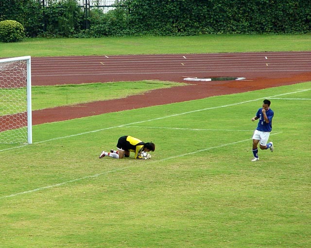 對方守門員面對連續(xù)不斷的進(jìn)攻,顯得有點(diǎn)手忙腳亂。