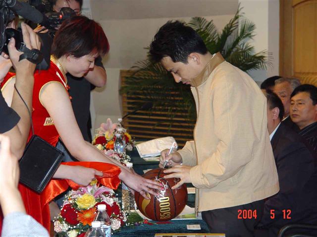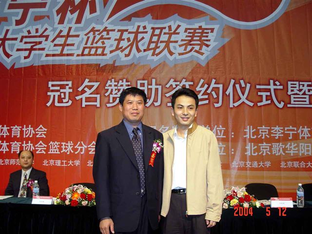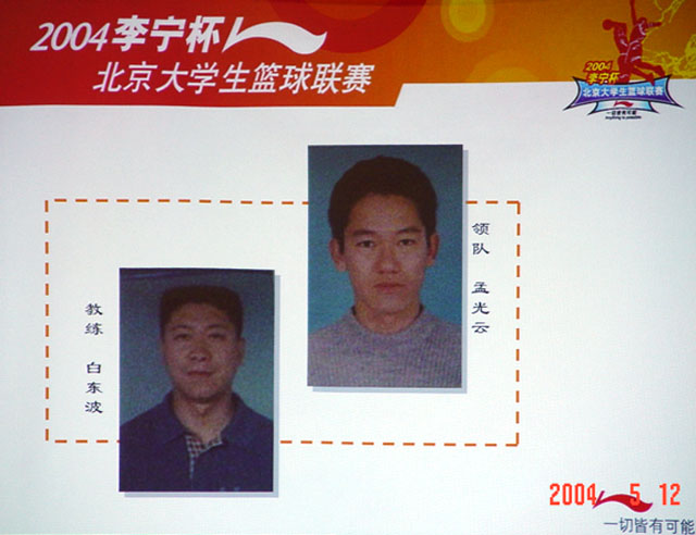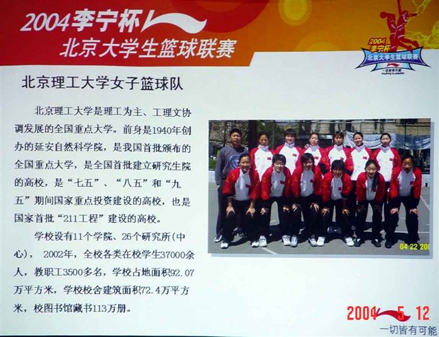 2004年5月12日下午,人民大學(xué)逸夫館,在由北京市體育協(xié)會(huì)和北京大學(xué)生籃球協(xié)會(huì)聯(lián)合主辦、由李寧公司贊助的第八屆北京大學(xué)生籃球聯(lián)賽的新聞發(fā)布會(huì)上,來(lái)自首都11所高校的領(lǐng)導(dǎo)以聯(lián)名籃球的形式宣布新一輪較量開(kāi)始,大學(xué)生運(yùn)動(dòng)員代表更是喊出了“圓夢(mèng)2008,一切皆有可能!”的高?;@球宣言。