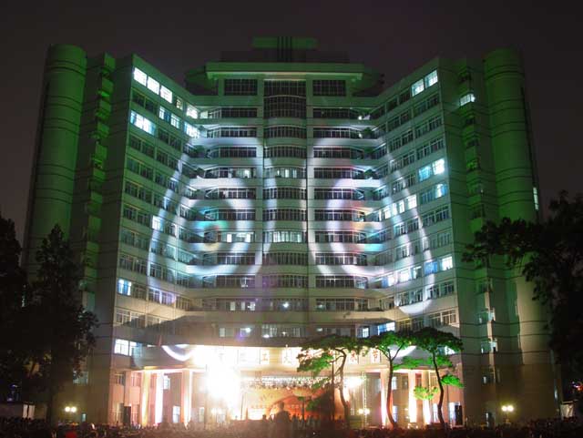 北京理工大學藝術節(jié)開幕式晚會現(xiàn)場把中心教學樓映襯得五彩繽紛。
