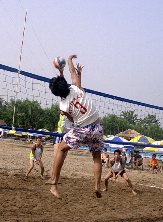 沙灘排球運(yùn)動(dòng)近年來(lái)因其技術(shù)多變,觀賞性高而受到青睞。本次比賽是推廣大學(xué)生排球運(yùn)動(dòng)的一個(gè)新的嘗試,受到了眾多高校的重視和支持,男子乙組共有七支隊(duì)伍參賽,都是室內(nèi)比賽的佼佼者。我校派出了主攻手車(chē)雪,接應(yīng)張若松,翟崎,副攻付旭東,二傳胡欣的高快結(jié)合的陣容,平均身高在1米85以上,具有明顯的網(wǎng)前優(yōu)勢(shì)。由于采用雙敗淘汰制,要求選手一天中至少打5場(chǎng)比賽,加上天氣炎熱,日曬強(qiáng)烈,比賽中隊(duì)員們克服了諸多困難,配合默契,團(tuán)結(jié)一致,戰(zhàn)術(shù)靈活,每球必爭(zhēng),充分發(fā)揚(yáng)了拼搏精神,展示了理工大學(xué)選手的風(fēng)采。