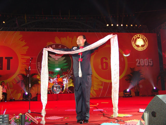 文藝晚會(huì)的壓軸大戲是我校兼職教授、著名蒙古族歌唱家騰格爾和他的“蒼狼”樂(lè)隊(duì)的勁爆演出。