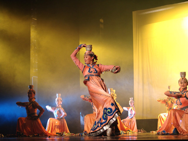 蒙古族女子群舞《頂碗》取材于傳統(tǒng)的舞蹈形式,但創(chuàng)作中卻融入了許多現(xiàn)代舞蹈的新動態(tài)語匯,使之在視覺上不但美觀大方,在技術(shù)技巧上也變得高難和復(fù)雜。該作品有意淡化作品的情節(jié)性,突出傳統(tǒng)舞種的形式美,力圖將傳統(tǒng)民族舞蹈形式挖掘到極致,表達(dá)了少女們喜悅的心情。