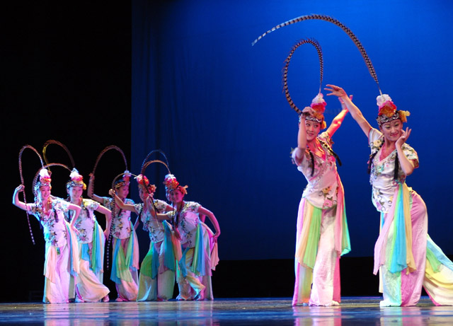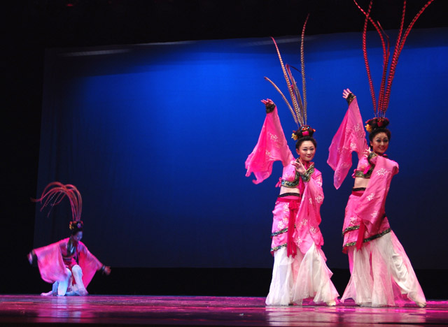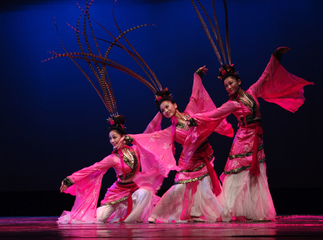古典女子三人舞《楚腰》。相傳先秦時候楚靈王好細(xì)腰,楚地女子以腰細(xì)為美,楚地又盛行巫風(fēng),婆娑歌舞,事神娛神也就成了楚人的“時尚”。