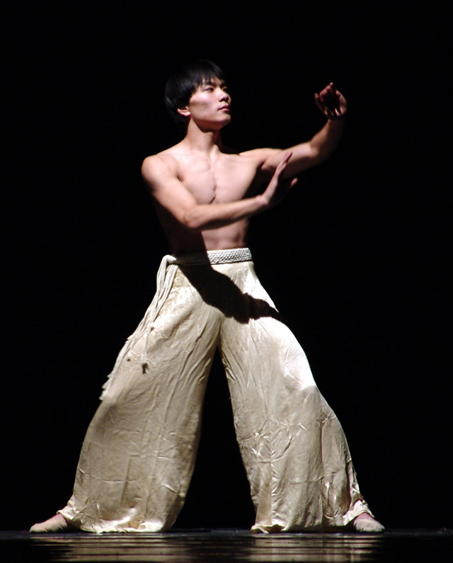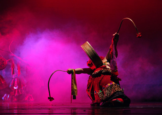 這個舞蹈根據(jù)楚文化的歷史訊息,也參考了湘、桂邊境銅鼓飾紋中的羽人形象,試圖表現(xiàn)先秦時代樸拙的舞風(fēng)、坦蕩狂放的巫女神韻和不同于后世的秀麗嫵媚。