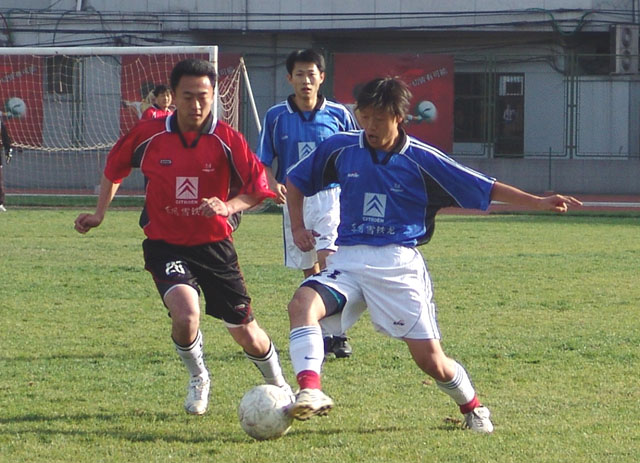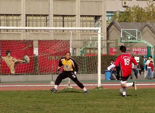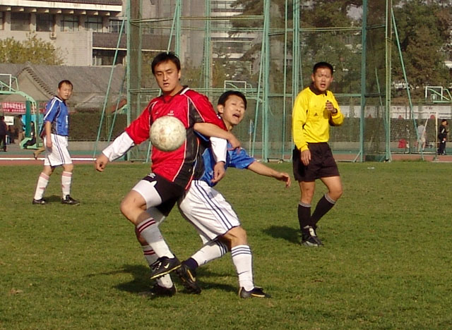在與清華大學(xué)隊(duì)爭(zhēng)奪季軍的比賽中(紅衣為我校足球隊(duì))
