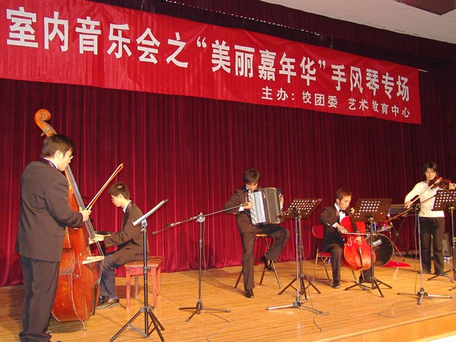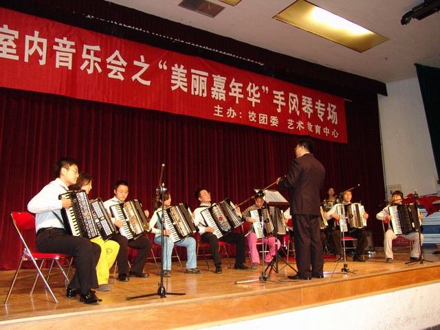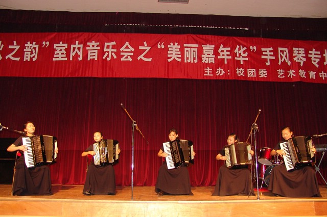 11月23日晚,2005年“秋之韻”系列音樂(lè)會(huì)手風(fēng)琴專(zhuān)場(chǎng)演出在中心教學(xué)樓一層報(bào)告廳舉行。音樂(lè)會(huì)在優(yōu)美的手風(fēng)琴合奏《美麗嘉年華》的旋律中拉開(kāi)了帷幕。