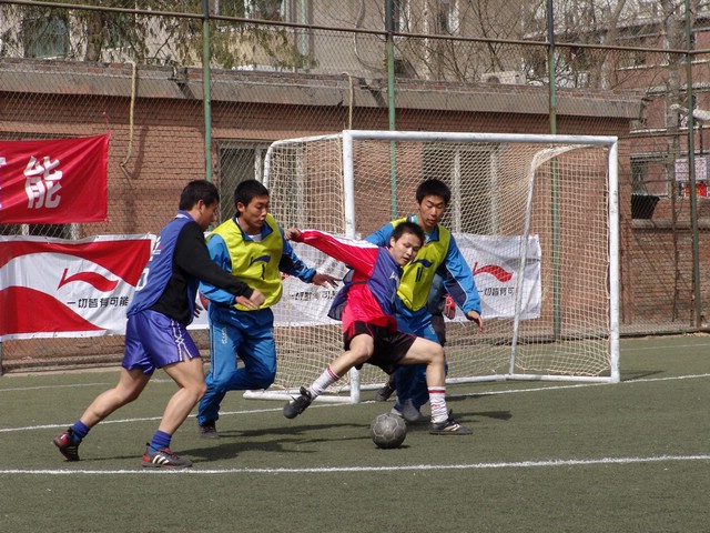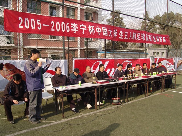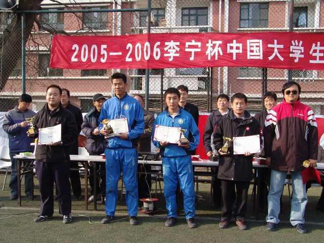 3月26日下午,在中國人民大學(xué)體育場進(jìn)行了“2005-2006李寧杯中國大學(xué)生五人制足球聯(lián)賽”北京賽區(qū)的決賽,我校足球隊(duì)頑強(qiáng)拼搏,不畏強(qiáng)敵,以1:0戰(zhàn)勝清華大學(xué)隊(duì),奪得北京賽區(qū)冠軍。