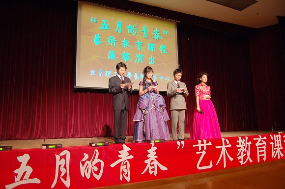 5月25日晚七點(diǎn),由藝術(shù)教育中心主辦的“五月的青春——藝術(shù)教育課程匯報(bào)演出”在中心教學(xué)樓報(bào)告廳隆重舉行。北京理工大學(xué)副書記、副校長(zhǎng)楊賓,教務(wù)處原副處長(zhǎng)王悅音,團(tuán)委書記張啟鴻,校教學(xué)指導(dǎo)委員會(huì)專家龔紹文、李惠生,藝術(shù)教育中心主任龐海芍、藝術(shù)總監(jiān)賀春華,校園網(wǎng)新聞網(wǎng)主編段煉,教務(wù)處的田鳳琴老師,校團(tuán)委的謝瀟儀老師,藝術(shù)教育中心的教師們和數(shù)百名學(xué)生一起觀看了演出。