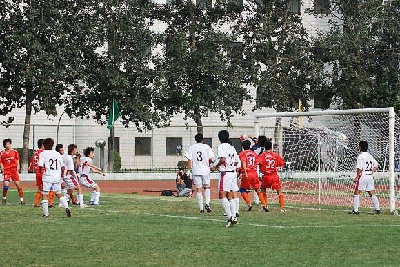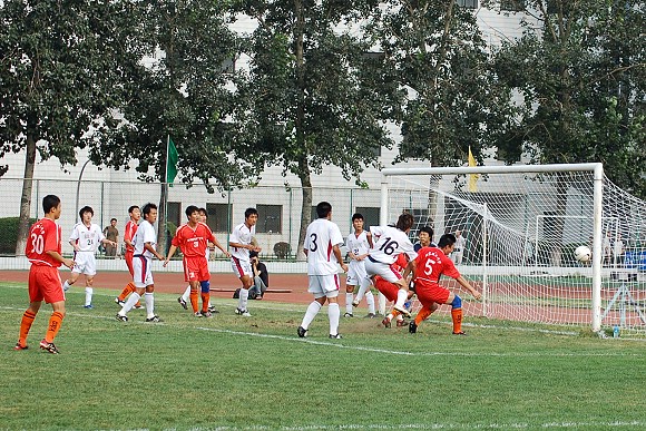 比較剛剛進行到第5分鐘,我方球員在對方禁區(qū)內(nèi)爭頂。