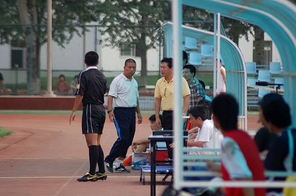 面對如此的偏袒行為,我校足球隊總教練金志揚也忍耐不住,向第四裁判提出交涉。