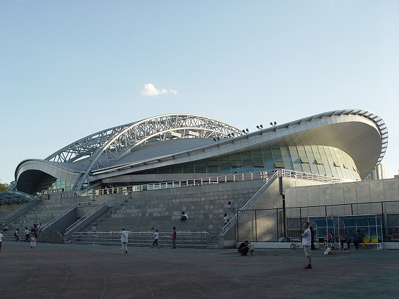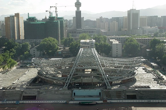 2005年6月1日,“六一”兒童節(jié)里的體育館,鋼頂結(jié)構(gòu)已經(jīng)基本完成。