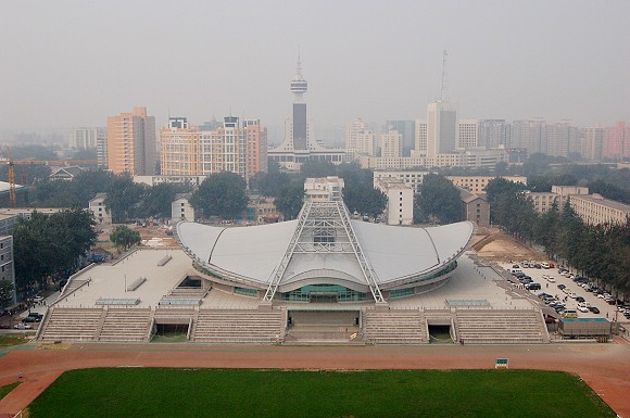 2005年9月20日,從剛竣工的大學(xué)生公寓2號(hào)樓頂上俯瞰校園,體育館儼然為校園的中心。