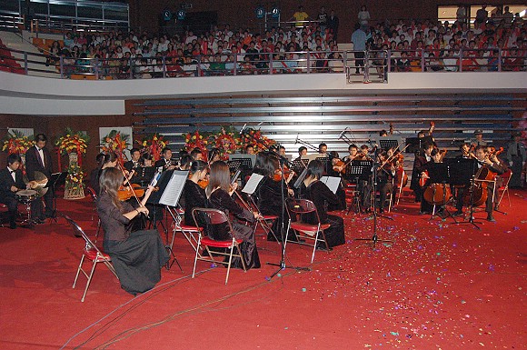 開(kāi)幕式晚會(huì)在我校交響樂(lè)團(tuán)雄壯的交響樂(lè)演出中拉開(kāi)帷幕。