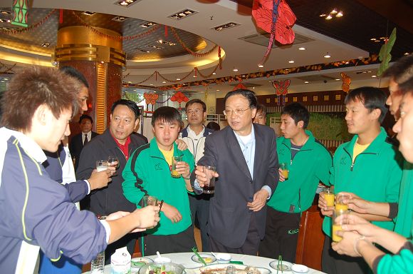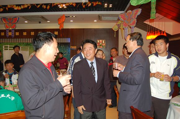 匡鏡明校長在舉杯預(yù)祝北京理工大學(xué)清研利華足球隊旗開得勝、馬到成功!