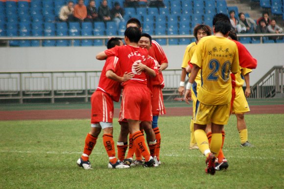 北理工的幾名球員興奮地抱在一起慶祝這來(lái)之不易的進(jìn)球。