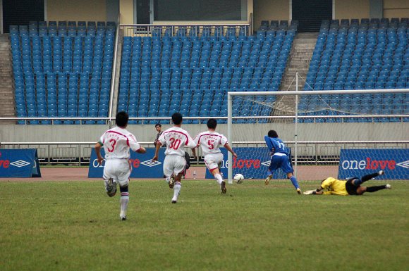 這時(shí)我校足球隊(duì)點(diǎn)球?qū)<?號于飛正好拍馬趕到,一腳勁射,差點(diǎn)將球網(wǎng)射破!