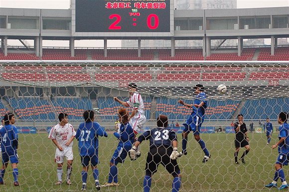 上半場第30分鐘,北理工隊(duì)員頭球射門,球竟然打在橫梁上彈出,令人惋惜。