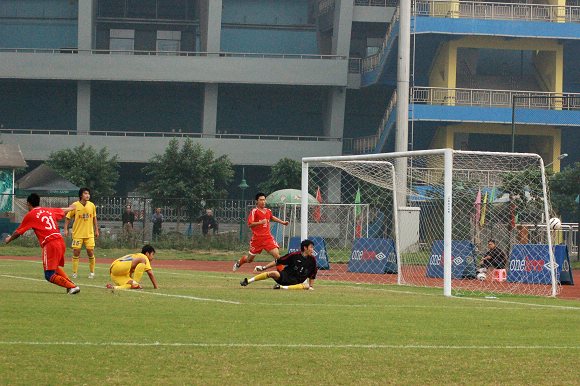 經(jīng)過(guò)前場(chǎng)積極的拼搶?zhuān)曳浇K于在最后一刻獲得了一次左路前場(chǎng)任意球,8號(hào)隊(duì)長(zhǎng)袁微準(zhǔn)確地將球吊至對(duì)方球門(mén)前,面對(duì)天津火車(chē)頭高大后衛(wèi)的圍剿,我方身高沒(méi)有任何優(yōu)勢(shì)的邊衛(wèi)24號(hào)楊揚(yáng)奮力爭(zhēng)頂,在對(duì)方守門(mén)員幾乎沒(méi)有任何心理準(zhǔn)備和反應(yīng)的情況下,皮球竟然劃過(guò)一道優(yōu)美的弧線后射入了球門(mén)的死角~~~
