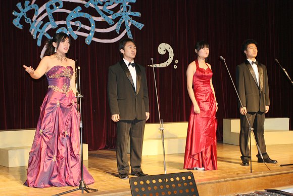 混聲四重唱《為什么不盡情歌唱》把現(xiàn)場(chǎng)氣氛推向了高潮。這是捷克斯美塔納歌劇《被出賣的新嫁娘》中的著名唱段。最后,大家欣賞到了兩組中國(guó)民歌?!兑拭缮叫≌{(diào)》、《洗衣歌》、《草原上升起不落的太陽》等大家耳熟能詳?shù)母枨延^眾再一次帶入回憶之中。