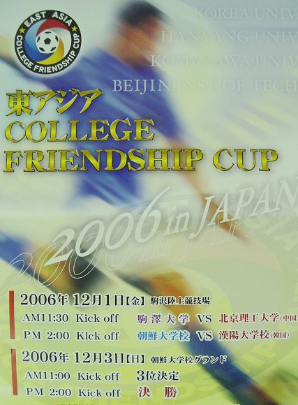 北京理工大學(xué)足球隊(duì)于11月29日啟程并順利抵達(dá)日本東京奧林匹克青少年活動(dòng)中心,在即將開(kāi)始的三國(guó)四隊(duì)的東亞大學(xué)生足球邀請(qǐng)賽中,12月1日將與日本的駒澤大學(xué)隊(duì)首先交手(由駒澤大學(xué)隊(duì)主力隊(duì)員組成的日本大學(xué)生足球隊(duì)曾連續(xù)獲得2003年和2005年兩屆世界大運(yùn)會(huì)足球比賽的冠軍,在2003年韓國(guó)世界大運(yùn)會(huì)足球項(xiàng)目的八進(jìn)四比賽中,由我校足球隊(duì)組成的中國(guó)大學(xué)生足球隊(duì)與其戰(zhàn)成平局,最后在點(diǎn)球大戰(zhàn)中惜敗,爾后取得了第七名的成績(jī)),獲勝的球隊(duì)將在12月3日與朝鮮大學(xué)隊(duì)和漢陽(yáng)大學(xué)隊(duì)之間的勝者爭(zhēng)奪冠軍,而首戰(zhàn)落敗的球隊(duì)將只能在同一天爭(zhēng)奪第三名。由于我校足球隊(duì)是以四屆全國(guó)大學(xué)生足球聯(lián)賽冠軍和剛剛沖入中國(guó)足協(xié)甲級(jí)聯(lián)賽的惟一一支“學(xué)生軍”的身份應(yīng)邀參加此項(xiàng)國(guó)際大學(xué)生足球賽事,在國(guó)家隊(duì)、國(guó)奧隊(duì)、國(guó)青隊(duì)、國(guó)少隊(duì)一路走低的情況下,這項(xiàng)代表著東亞大學(xué)生足球最高水平的賽事也引起了足球界及各大媒體的廣泛關(guān)注。