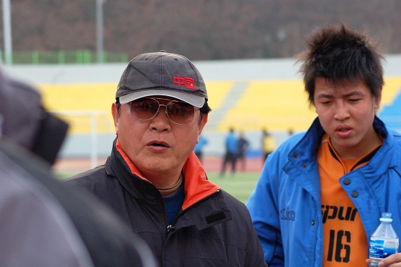 北京理工大學(xué)足球隊(duì)主教練金志揚(yáng)在中場休息時(shí)調(diào)整戰(zhàn)術(shù)。
