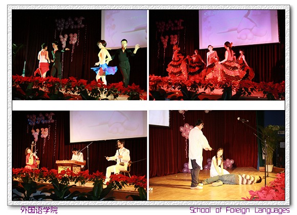國際關(guān)系學院和我院合作演出《西班牙女郎》精彩無限;首都經(jīng)濟貿(mào)易大學一曲新民樂《war》,用琵琶、二胡、揚琴盡展民族藝術(shù)魅力;外國語學院“歌后”畢曉寧老師一曲《上海灘》蕩氣回腸;娃娃劇社《新編羅密歐與朱麗葉》風趣幽默;贊比亞留學生一曲《I'm here》引發(fā)高潮……