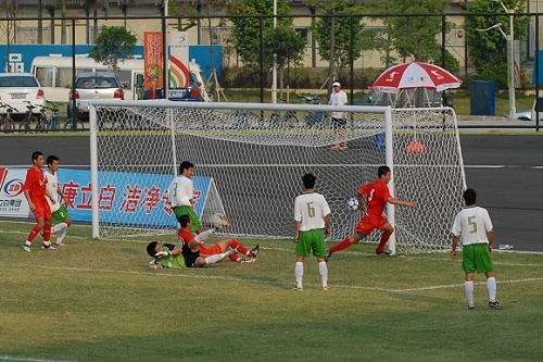 北理工隊(duì)前鋒18號(hào)楊思源和后衛(wèi)3號(hào)盧斌雙箭齊發(fā),搶點(diǎn)門前,并由盧斌將對(duì)方守門員脫手之球補(bǔ)射網(wǎng)內(nèi)。