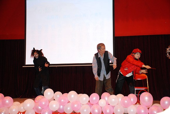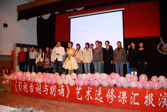 2007年12月13日晚七點整,在我校七號教學樓107報告廳,由藝術教育中心主辦,藝術教育中心楊海濱主任總策劃,藝術教育中心教師余鳳霞老師指導的《影視臺詞與朗誦》藝術選修課程匯報演出隆重舉行。人文學院副院長、藝術教育中心主任楊海濱老師,校新聞網(wǎng)編輯、高級攝影師段煉老師,以及藝術教育中心教師王穎、張乃鳳、王倩,許晶,曲香竹出席了晚會。