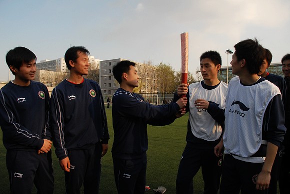 馮軍將奧運會火炬交給隊員們,以內(nèi)部傳遞的方式,讓隊員們感受團(tuán)結(jié)、友愛的奧運精神,并鼓勵他們,不拋棄不放棄,力爭在新的賽季取得更好成績。