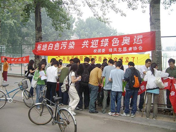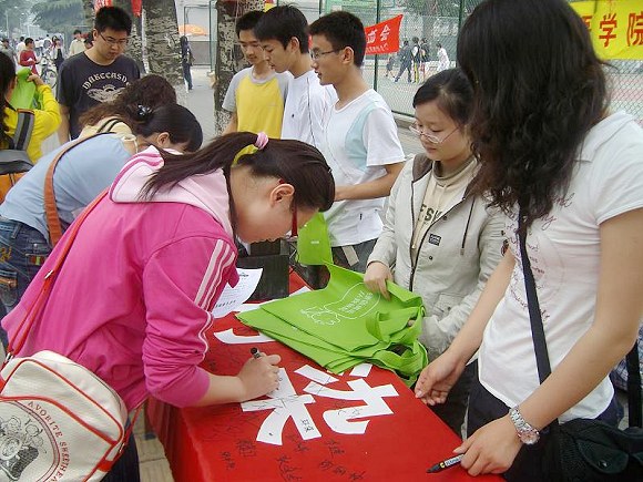在活動(dòng)中,我們倡議大家在橫幅上簽名,以表示自己支持綠色奧運(yùn)、拒絕白色污染,簽名現(xiàn)場(chǎng)異?;鸨?。