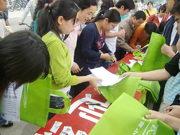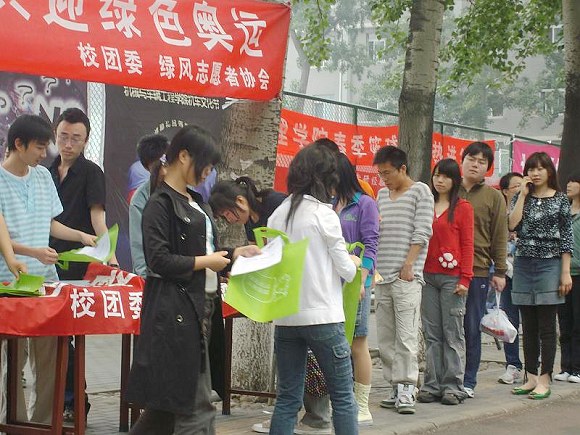 中午11點(diǎn)開(kāi)始,綠風(fēng)的成員在新食堂北側(cè)收拾好場(chǎng)地,做好了活動(dòng)的準(zhǔn)備。在我們掛出橫幅后,不一會(huì)就吸引了好多的同學(xué)詢問(wèn),成員們耐心的講解白色污染以及其危害的知識(shí),并號(hào)召同學(xué)們放棄使用塑料袋,為北京奧運(yùn)貢獻(xiàn)自己的一份力量,引起同學(xué)們的歡迎。在當(dāng)時(shí)的情景中,我們可以感受到大家為北京奧運(yùn)努力的熱切決心,使我們深受感動(dòng)。