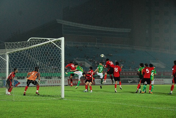 由于對(duì)雙方來(lái)講比賽壓力很大,因此在開(kāi)場(chǎng)后雙方打的十分保守,都沒(méi)過(guò)多投入兵力。因此雙方在前30分鐘內(nèi)幾乎不見(jiàn)射門(mén)。第33分鐘分鐘,愛(ài)國(guó)者隊(duì)獲得前場(chǎng)任意球,皮球從門(mén)前劃過(guò)被門(mén)將撲出,制造出一片混亂。一分鐘后宏登隊(duì)趙闊吊射稍高出橫梁。