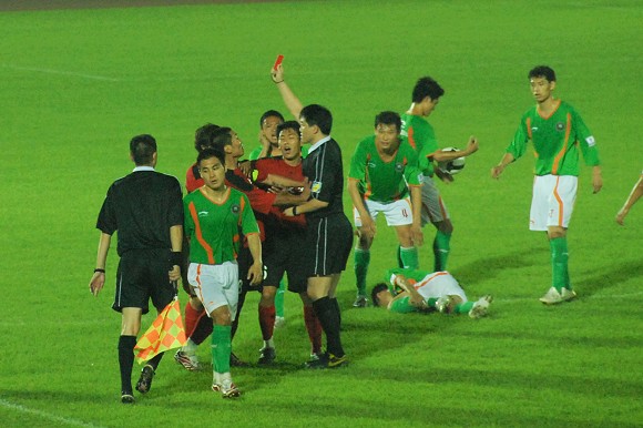 第78分鐘,宏登隊(duì)賈偉假摔兩黃變一紅被裁判罰下,隨后隊(duì)長(zhǎng)趙闊上前理論又被裁判掏出紅牌,此后宏登以9人應(yīng)戰(zhàn)。第86分鐘宏登隊(duì)曲鵬主罰任意球高出橫梁。
