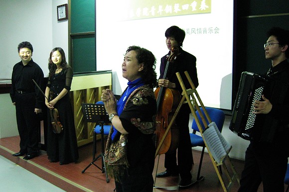 10月25日晚7時,2008藝術(shù)節(jié)項(xiàng)目:由中央音樂學(xué)院青年五重奏小組完成的“南美風(fēng)情”室內(nèi)音樂會在良鄉(xiāng)校區(qū)理科教學(xué)樓304教室舉行。整個教室座無虛席,觀眾興致勃勃的欣賞了十九世紀(jì)德國著名作曲家孟德爾松以及俄國作曲家拉赫瑪尼諾夫等音樂家的獨(dú)、重奏作品。