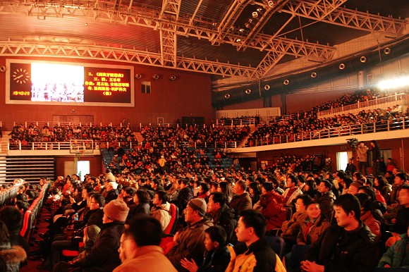 在回顧了歷次新年音樂會(huì)的精彩花絮之后,2009年新年音樂會(huì)正式拉開了帷幕。由校大學(xué)生藝術(shù)團(tuán)交響樂團(tuán)帶來的一曲節(jié)奏歡快的《北京喜訊到邊寨》,在體育館中營造了喜慶熱烈的新年氛圍。