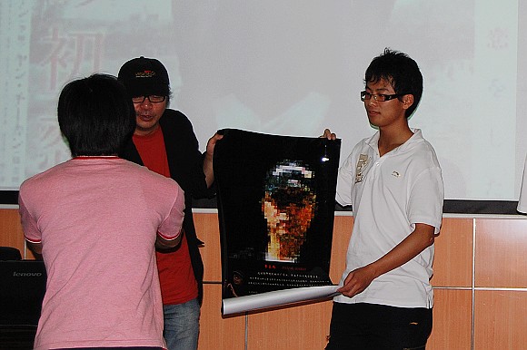 最后同學(xué)們送給章導(dǎo)一副原創(chuàng)的印有章導(dǎo)照片的宣傳畫,其中人物影像是由章導(dǎo)系列作品中的分鏡頭拼成的,章導(dǎo)非常高興,也送給紅河影碟作為禮物,并與同學(xué)們達(dá)成一個(gè)美好的約定,章導(dǎo)系列電影音樂欣賞演奏會(huì)將在理工大學(xué)進(jìn)行首演。