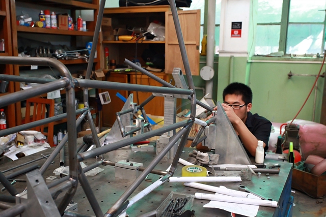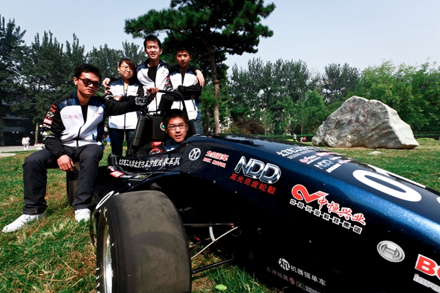 在缺少技術(shù)的情況下,隊(duì)員們不斷探索,通過翻譯國外技術(shù)論文、咨詢國際一流車隊(duì)、調(diào)研國內(nèi)賽車行業(yè)等方式,積累了一定的設(shè)計(jì)資料,歷時6個月完成了賽車的設(shè)計(jì)、制造工作。由于沒有專業(yè)的賽車測試場地,車隊(duì)先后轉(zhuǎn)戰(zhàn)良鄉(xiāng)校區(qū)和通州卡丁車場進(jìn)行賽車性能的調(diào)試,最終克服了重重困難,于10月初完成了賽車的測試及車手訓(xùn)練工作。